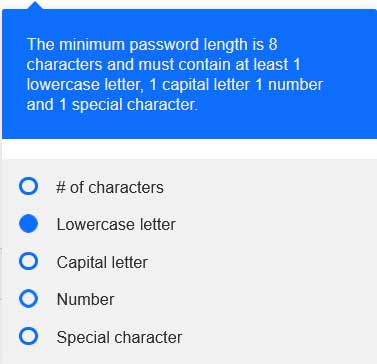 Create a strong password. The minimum password length is 8 characters and must contain at least 1 lowercase letter, 1 capital letter, 1 number, and 1 special character.